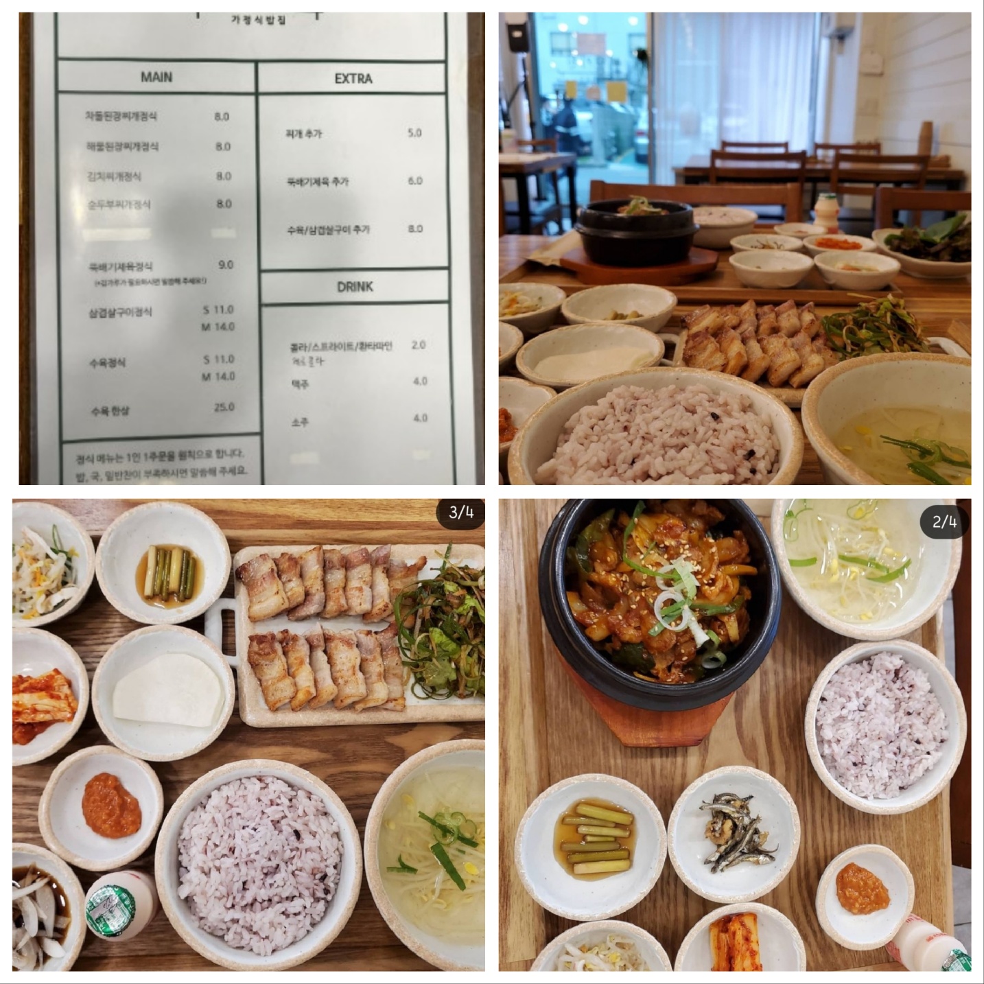 - 뚝배기제육정식 : 제육이 고추장에 아주 잘 버무려져 있는데요 이것 또한 쌈과 곁들이면 우리가 다 아는 맛인데도 불구하고 각각 집마다 고기의 간과 그 주변 반찬들의 조화로움에서 호불호가 갈리죠. 여기는 누가 먹어도 입에 쩍 붙을 거예요. 각각 개인 쟁반에 깔끔하게 나온 답니다.