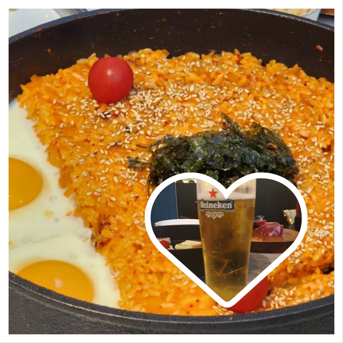 깍두기볶음밥 : 고기먹은후 밥이죠. 깍두기 넣고 볶음밥을 해주시는데 모양도 스마일캐릭터로 이쁘게 잡아주시는 센스 우리가 아는 그 맛이긴 하지만 묘하게 차별화가 있어요. 깍두기가 오독오독 씹히는 식감도 좋고 계속계속 바닥을 보일때까지 손이 자꾸만 갑니다. 알싸한 맥주는 덤이죠.