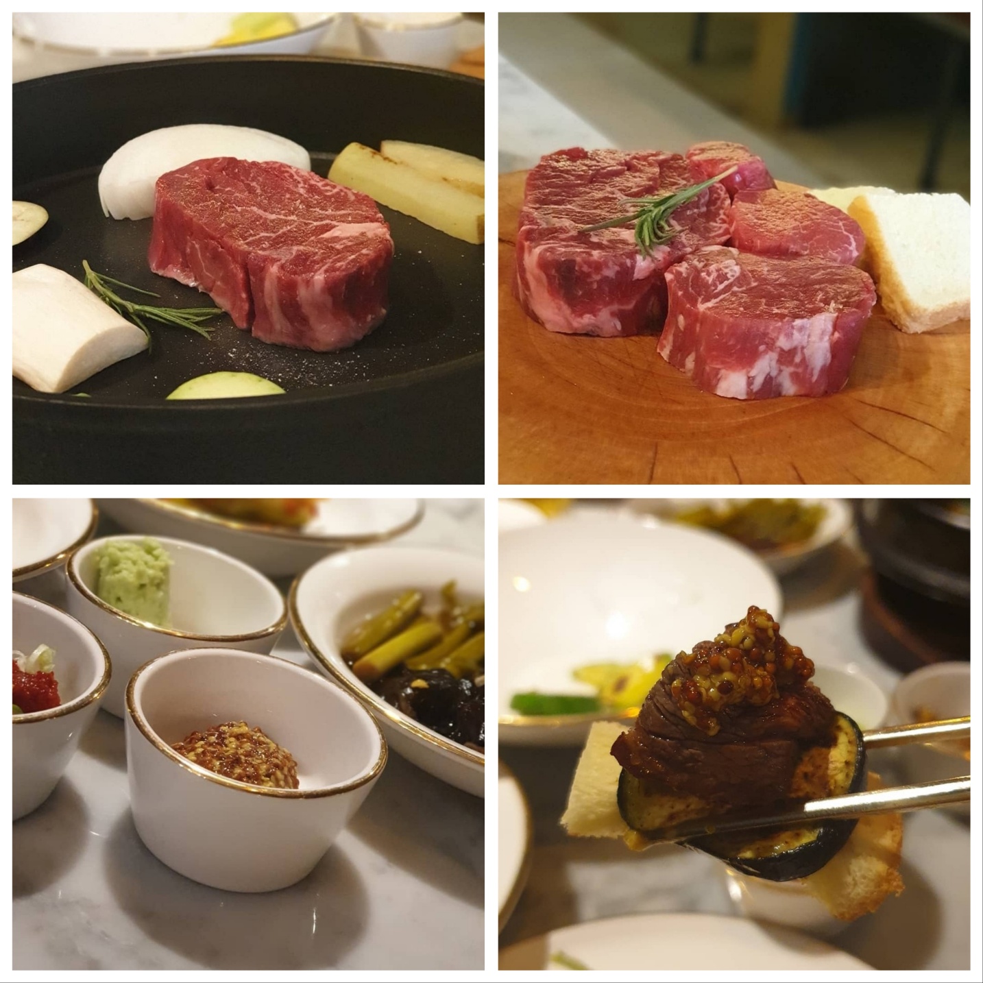 한우안심 : 고기모양부터가 아주 눈길을 사로잡았네요 직접 구워주시고 각각 개인접시에 맛보라며 일일이 맛있게 구운 후 올려주셨어요. 거기다 먹는 방법까지 친절히 설명해 주신답니다. 기본사이드도 반찬류도 너무너무 상큼하고 맛있어요