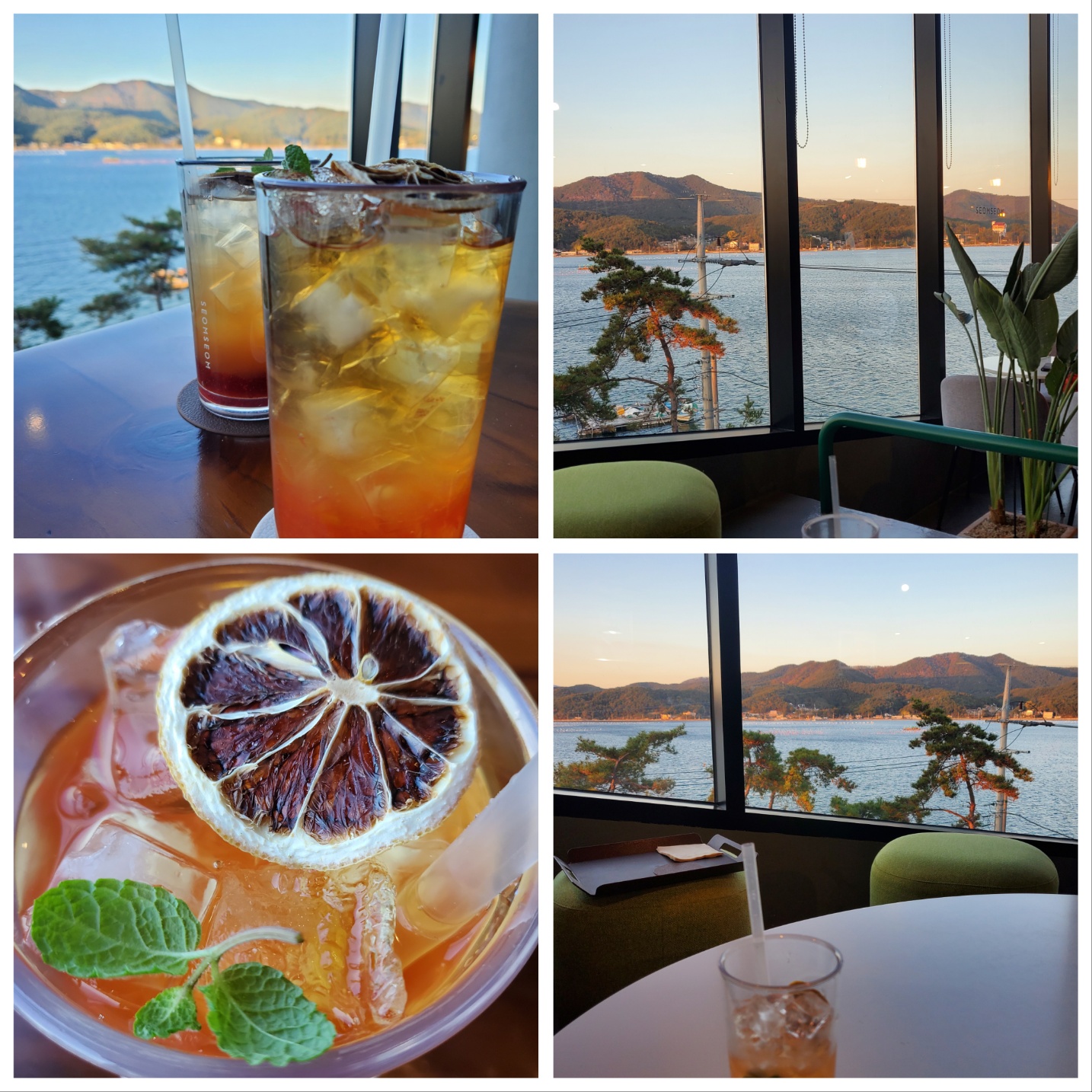 저는 카페투어로 두번째 방문카페라 커피를 많이 즐겼기에 색다른 음료를 주문해 봤답니다. 섬섬아이스티인데 시그니쳐 메뉴더라고요. 한라봉청으로 함께 맛을 냈는데 플레이팅도 이쁘고 맛도 제입맛엔 좋더라고요. 달달함에 기분이 up! 바다조망에 제맘도 up! 통창 앞에 자리가 없다가 한자리 나서 룰루랄라 바로 옮겼죠.