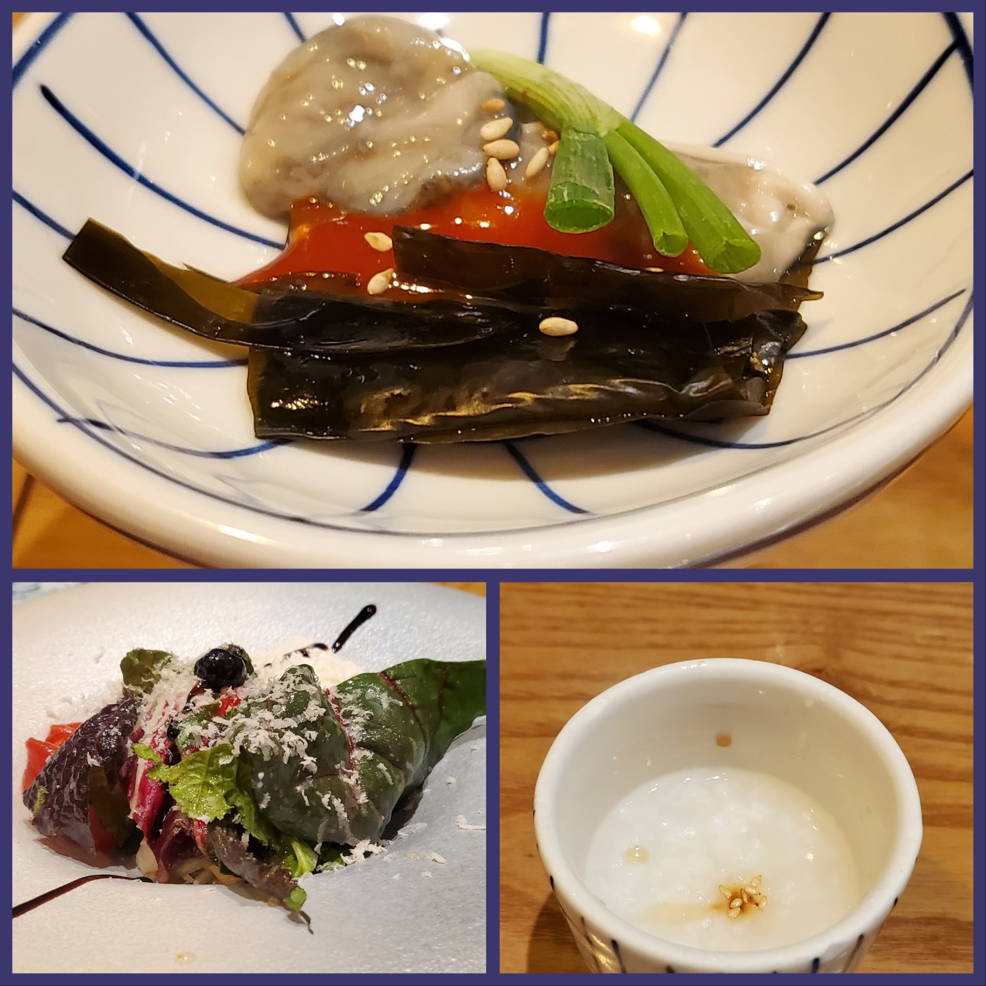 - 쌀죽으로 처음에 입을 적시고요 바다향 가득한 한입에 먹을 수 있는 굴과 미역이 나옵니다. 다음에는 리코타치즈 샐러드가 나와요.