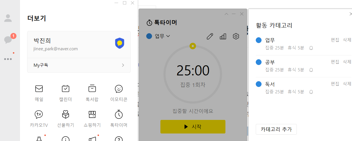 톡타이머는 pc버전에서만 사용됩니다. 아래그림처럼 더보기를 누른 후->톡타이머->시작을 누르시면 됩니다.